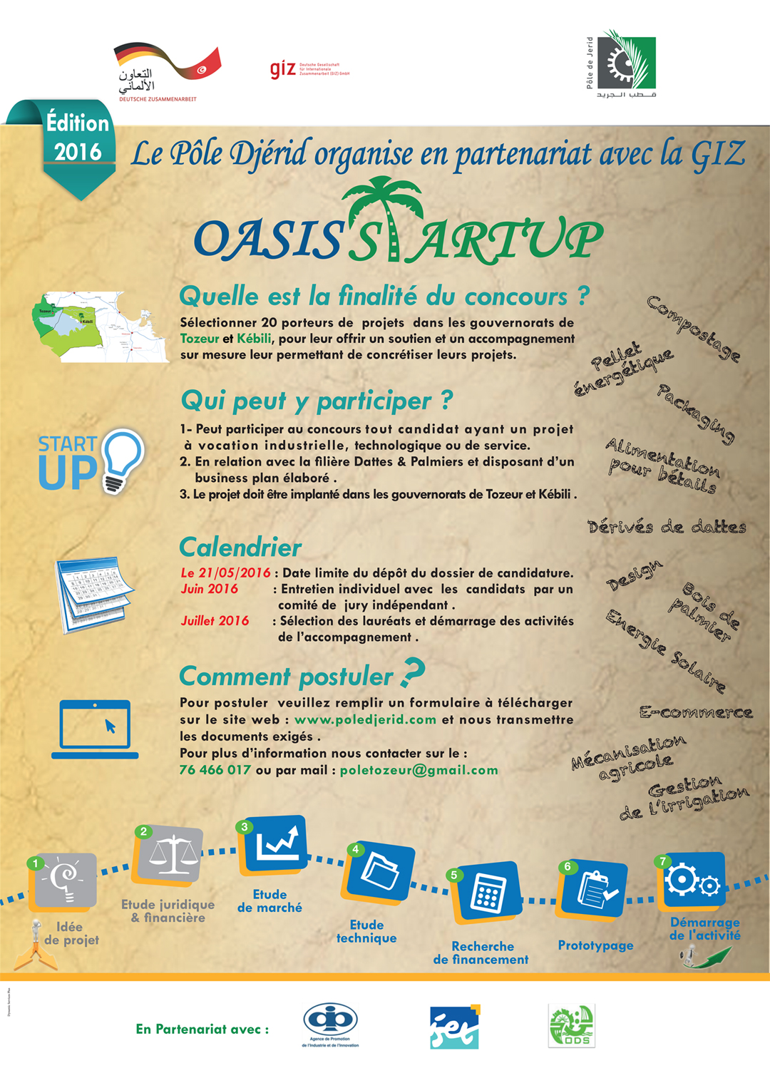Dans le cadre du projet "Cluster Dattes & Palmiers Tunisie"le Pole de Djérid en partenariat avec la GIZ, Agence Allemande de Coopération Internationale de part sa Composante Initiative en Tunisie, Co-organisent le concours « Oasis START’UP 2016 » en association avec l’Agence de Promotion de l’Industrie et de l’Innovation, l’Office de Développement du Sud et l’Institut Supérieur des Etudes Technologiques dans les deux gouvernorats de Tozeur et Kébili.